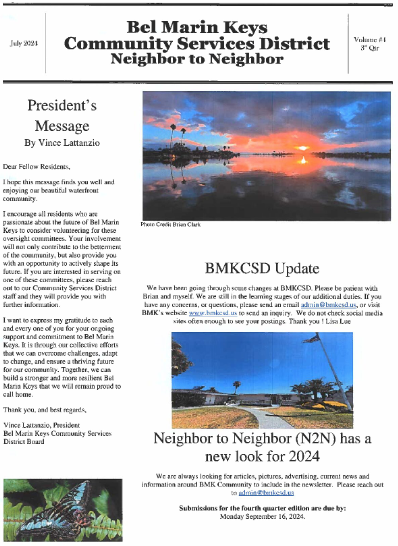 Bel Marin Keys is a waterfront development located in an unincorporated portion of northeastern Marin County, California, approximately 3 miles east of US 101, 4 miles east of the City of Novato and approximately 25 miles north of the City of San Francisco. A community of 702 single family homes, Bel Marin Keys is surrounded by open space, bounded by tidal wetlands owned by the California State Coastal Conservancy to the south; east and west of Novato Creek and farm land managed by the Novato Sanitary District and the County of Marin Flood Control District to the North and Northeast. The community surrounds two man made lagoons, each in excess 100 acres, which open to Novato Creek via locks and provide homeowners with water access to San Pablo Bay.